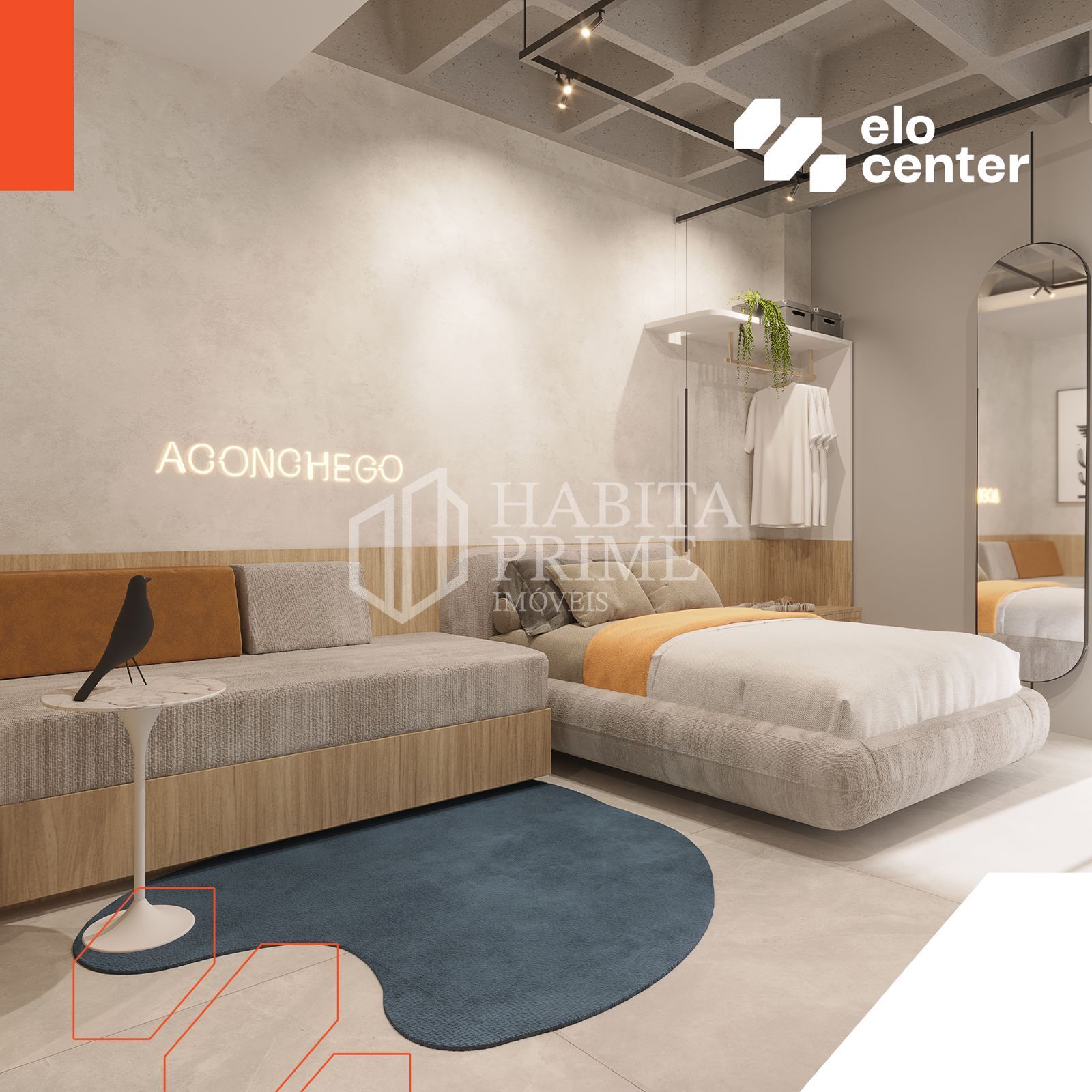 - 104 flats residenciais, com opções de 29,30 m² a 44,05 m², compostos por quarto integrado, sala de estar ou home office, cozinha e banheiro;